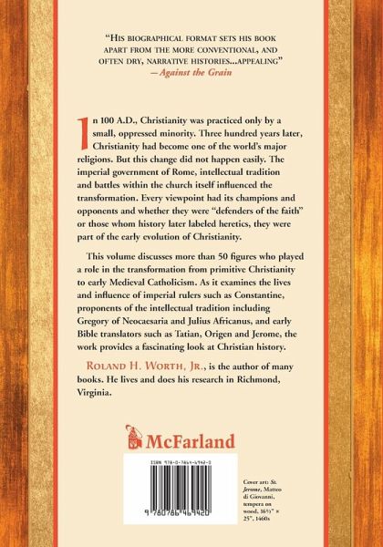 In 100 A.D., Christianity was practiced only by a small, oppressed minority. Three hundred years later, Christianity had become one of the world's major religions. But this change did not happen easily. The imperial government of Rome, intellectual tradition and battles within the church itself influenced the transformation. Every viewpoint had its champions and opponents and whether they were ""defenders of the faith"" or those whom history later labeled heretics, they were part of the early evolution of Christianity. This volume discusses more than 50 figures who played a role in the transformation from primitive Christianity to early Medieval Catholicism. As it examines the lives and influence of imperial rulers such as Constantine, proponents of the intellectual tradition including Gregory of Neocaesaria and Julius Africanus, and early Bible translators such as Tatian, Origen and Jerome, the work provides a fascinating look at Christian history.