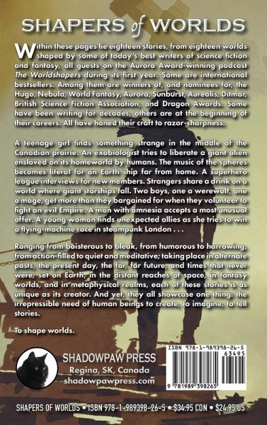 The first in a series of blockbuster anthologies featuring authors featured on the Aurora Award-winning podcast The Worldshapers Within these pages lie eighteen stories, from eighteen worlds shaped by some of today's best writers of science fiction and fantasy, all guests on the Aurora Award-winning podcast The Worldshapers during its first year. There are never-before-seen stories by Tanya Huff, Seanan McGuire, David Weber, L.E. Modesitt, Jr., John C. Wright, D.J. Butler, Christopher Ruocchio, Shelley Adina, and Edward Willett, plus outstanding fiction by John Scalzi, Joe Haldeman, David Brin, Julie E. Czerneda, Fonda Lee, Gareth L. Powell, Dr. Charles E. Gannon, Derek Künsken, and Thoraiya Dyer. Among these authors are international bestsellers , and winners of and nominees for the Hugo, Nebula, World Fantasy, Aurora, Sunburst, Aurealis, Ditmar, British Science Fiction Association, and Dragon Awards. Some have been writing for decades, others are at the beginning of their careers. All have honed their craft to razor-sharpness. A teenage girl finds something strange in the middle of the Canadian prairie. An exobiologist tries to liberate a giant alien enslaved on its homeworld by humans. The music of the spheres becomes literal for an Earth ship far from home. A superhero league interviews for new members. Strangers share a drink on a world where giant starships fall. Two boys, one a werewolf, one a mage, get more than they bargained for when they volunteer to fight an evil Empire. A man with amnesia accepts a most unusual offer. A young woman finds unexpected allies as she tries to win a flying-machine race in steampunk London . . . Ranging from boisterous to bleak, from humorous to harrowing, from action-filled to quiet and meditative; taking place in alternate pasts, the present day, the far, far future, and times that never were; set on Earth, in the distant reaches of space, in fantasy worlds, and in metaphysical realms, each of these stories is as unique as its creator. And yet, they all showcase one thing: the irrepressible need of human beings to create, to imagine, to tell stories: To shape worlds.