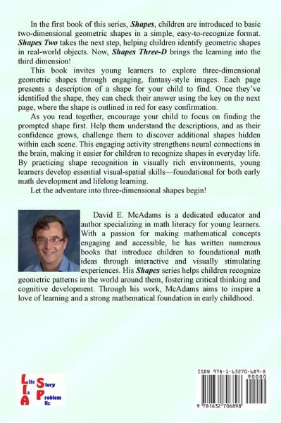 Shapes Three-D builds upon the foundation established in Shapes, introducing young readers to three dimensional shapes such as cubes and spheres. This book challenges readers to identify geometric forms contained within fantasy inspired images. By engaging in this search, children strengthen their visual recognition, pattern detection, and cognitive development in a fun and engaging way. Each page presents a specific shape for children to find, reinforcing spatial awareness and problem-solving skills. After making their discoveries, they can check their answers using a key at the back of the book, where the prompted shapes are outlined in red. However, additional occurrences of the shape may exist within the image, encouraging deeper exploration and critical thinking. As shapes can appear differently from various angles, this book also introduces young learners to the concept of perspective. For example, on page 28, salt crystals with square sides may appear as diamonds when viewed from a corner. If your child is puzzled by this, try finding objects of similar shapes at home and observing them from different angles to explore how perspective influences perception. To extend the learning experience, parents and educators can encourage children to identify additional shapes beyond those prompted, further enhancing their ability to recognize geometric forms in everyday environments. Shapes Three-D is part of a growing series, with future books introducing progressively more complex shape recognition challenges. These books help children refine their observational skills and develop a lifelong appreciation for the geometry that surrounds them.
