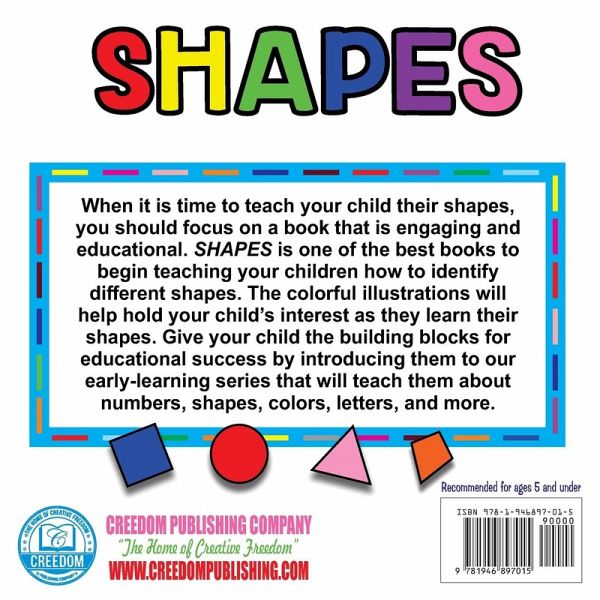 Teach your preschool child how to identify shapes and encourage learning with the Shapes book. This book is designed to be a toddler favorite with fun designs for each shape, from a circle to a hexagon. Develop your child's learning skills with the Creedom Early Learners Collection, which includes the following books: Animal Alphabet, Numbers, Shapes, Colors, Fruits, Vegetables, and more. The Creedom Early Learners Collection is specially designed to captivate a preschooler's attention while building the foundation for learning.