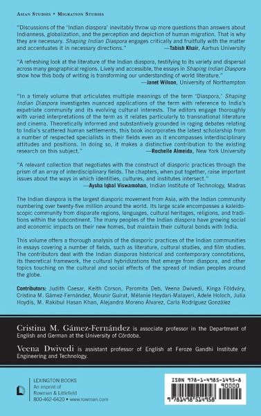 Introduction: Shaping Indian Diaspora, or the Instability of Human Morphoses, Cristina M. Gámez-Fernández and Veena Dwivedi Part I. Home Diaspora after Indian Partition Chapter 1: Stories of Hasan Azizul Huq and the Shaping of Indian Diaspora in post-Partition India, M. Rakibul Hasan Khan Part II. Great Britain and Scotland Chapter 2: "Seeing Through a Glass": Diasporic Identity in Vikram Seth's Two Lives, Mélanie Heydari Chapter 3: Roots and Routes in Meera Syal's Life Isn't All Ha Ha Hee Hee, Mounir Guirat Chapter 4: Indo-Scottish Cultural Flows: Bashabi Fraser and the Streams of Identity, Carla Rodríguez González Part III. United States of America Chapter 5: Rice and Fish: Food Rituals and Women in Lahiri's The Namesake and Divakaruni's The Vine of Desire, Paromita Deb Chapter 6: The Ebb and Flow of Homecoming-The Nature of Diasporic Existence in The Hungry Tide,Kinga Földváry Chapter 7: Historicizing Diaspora, Multiculturalism, and Migration in Amitav Ghosh's Sea of Poppies and River of Smoke, Julia Hoydis Part IV. Canada Chapter 8: Diaspora Identity in Kim and The Cat's Table, Judith Caesar Part V. Australia and New Zealand Chapter 9: Alternative Literary Spaces: India in the Antipodes, Alejandra Moreno Álvarez Chapter 10: Outside, Inside, and Somewhere In Between: Laughter and the Indian Diasporic Experience in A House for Mr Biswas and The White Tiger,Adele Holoch Part VI. Bollywood and Diaspora Chapter 11: Little Indias: Diasporic Communities in the US and the Consumption of Bollywood, Keith M. Corson