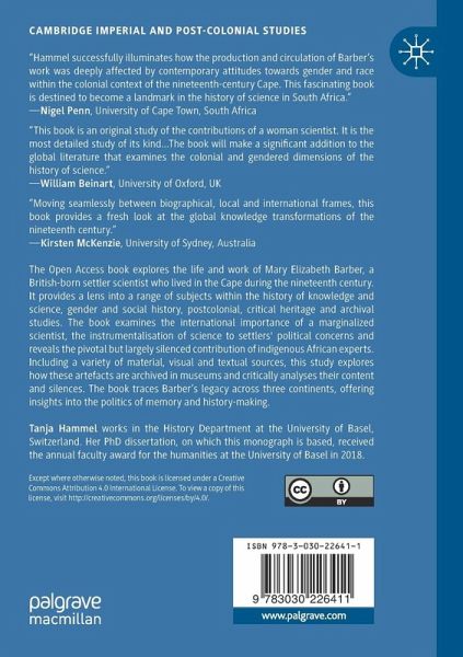 This book explores the life and work of Mary Elizabeth Barber, a British-born settler scientist who lived in the Cape during the nineteenth century. It provides a lens into a range of subjects within the history of knowledge and science, gender and social history, postcolonial, critical heritage and archival studies. The book examines the international importance of the life and works of a marginalized scientist, the instrumentalisation of science to settlers' political concerns and reveals the pivotal but largely silenced contribution of indigenous African experts. Including a variety of material, visual and textual sources, this study explores how these artefacts are archived and displayed in museums and critically analyses their content and silences. The book traces Barber's legacy across three continents in collections and archives, offering insights into the politics of memory and history-making. At the same time, it forges a nuanced argument, incorporating study of the North and South, the history of science and social history, and the past and the present.