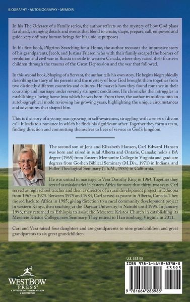 In his The Odyssey of a Family series, the author reflects on the mystery of how God plans far ahead, arranging details and events that blend to create, shape, prepare, call, empower, and guide very ordinary human beings for his unique purposes. In his first book, Pilgrims Searching for a Home, the author recounts the impressive story of his grandparents, Jacob, and Justina Friesen, who with their family escaped the horrors of revolution and civil war in Russia to settle in western Canada, where they raised their fourteen children through the trauma of the Great Depression and the war that followed. In this second book, Shaping of a Servant, the author tells his own story. He begins biographically describing the story of his parents and the mystery of how God brought them together from two distinctly different countries and cultures. He marvels how they found romance in their courtship and marriage under severely stringent conditions. He chronicles their struggles in establishing a loving home into which he was born. From there, the author transitions into an autobiographical mode reviewing his growing years, highlighting the unique circumstances and adventures that shaped him. This is the story of a young man growing in self-awareness, struggling with a sense of divine call. It leads to a romance in which he finds his significant other. Together they form a team, finding direction and committing themselves to lives of service in God's kingdom.