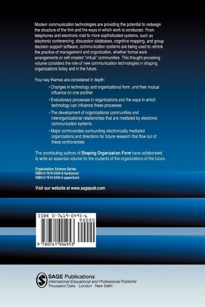 Shaping Organization Form considers the role of new communication technologies in shaping organizations today and in the future. Four key themes are considered in depth: changes in technology, changes in organizational form, and their mutual influence on one another; evolutionary processes in organizations and the ways in which technology can influence these processes; the development of organizational communities and inter-organizational relationships that are mediated by electronic communication systems; and major controversies surrounding electronically mediated organizations and directions for future research that flow out of these controversies.…mehr