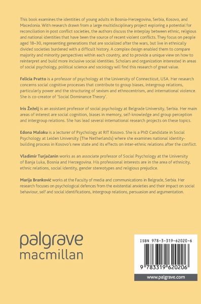 Foreword; Boris Bizumic.- Preface; Iris Zezelj.- 1. Introduction; Felicia Pratto.- 2. Setting the Stage: Research on National, Ethnic, and Religious Identities After the Recent Violent Conflicts in the Western Balkans; Marija Brankovic, Vladimir Turjacanin, Edona Maloku.- 3. Methods Section: Quantitative and Qualitative Examination of Social Identities and Their Mutual Relations; Olja Jovanovic, Marko Vladisavljevic, Iris Zezelj, Marija Brankovic.- 4. Ethnic, Religious, and National Identities Among Young Bosniaks and Serbs in Minority and Majority Contexts in Bosnia and Herzegovina.- Vladimir Turjacanin, Sr an Dusanic, Sinisa Lakic, Sabina Cehajic-Clancy, Maja Pulic de Sanctis.- 5. Is It Always Us or Them: How Do Young Serbs and Bosniaks Perceive Intergroup Borders?; Olja Jovanovic, Masa Pavlovic.- 6. Who Is This New We? Similarities and Differences of Ethnic, Religious, and National Identity Among the Albanian Majority and the Serb Minority in Post-Conflict Kosovo; Edona Maloku, Kaltrina Kelmendi, Marko Vladisavljevic.- 7. Towards Inclusive Social Identities in the Republic of Macedonia; Ali Pajaziti, Biljana Blazevska-Stoilkovska, Ana Fritzhand, Agron Rustemi, Admir Qose.- 8. What Identities in the Present May Mean for the Future of the Western Balkans; Iris Zezelj, Felicia Pratto.- Index.