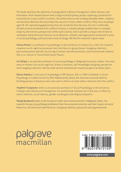 Foreword; Boris Bizumic.- Preface; Iris Zezelj.- 1. Introduction; Felicia Pratto.- 2. Setting the Stage: Research on National, Ethnic, and Religious Identities After the Recent Violent Conflicts in the Western Balkans; Marija Brankovic, Vladimir Turjacanin, Edona Maloku.- 3. Methods Section: Quantitative and Qualitative Examination of Social Identities and Their Mutual Relations; Olja Jovanovic, Marko Vladisavljevic, Iris Zezelj, Marija Brankovic.- 4. Ethnic, Religious, and National Identities Among Young Bosniaks and Serbs in Minority and Majority Contexts in Bosnia and Herzegovina.- Vladimir Turjacanin, Sr an Dusanic, Sinisa Lakic, Sabina Cehajic-Clancy, Maja Pulic de Sanctis.- 5. Is It Always Us or Them: How Do Young Serbs and Bosniaks Perceive Intergroup Borders?; Olja Jovanovic, Masa Pavlovic.- 6. Who Is This New We? Similarities and Differences of Ethnic, Religious, and National Identity Among the Albanian Majority and the Serb Minority in Post-Conflict Kosovo; Edona Maloku, Kaltrina Kelmendi, Marko Vladisavljevic.- 7. Towards Inclusive Social Identities in the Republic of Macedonia; Ali Pajaziti, Biljana Blazevska-Stoilkovska, Ana Fritzhand, Agron Rustemi, Admir Qose.- 8. What Identities in the Present May Mean for the Future of the Western Balkans; Iris Zezelj, Felicia Pratto.- Index.