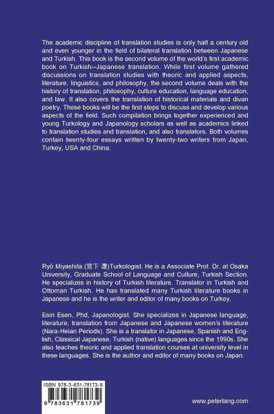 The academic discipline of translation studies is only half a century old and even younger in the field of bilateral translation between Japanese and Turkish. This book is the second volume of the world's first academic book on Turkish Japanese translation. While this volume gathered discussions on translation studies with theoric and applied aspects, literature, linguistics, and philosophy, the second volume deals with the history of translation, philosophy, culture education, language education, and law. It also covers the translation of historical materials and divan poetry. These books will be the first steps to discuss and develop various aspects of the field. Such compilation brings together experienced and young Turkology and Japanology scholars as well as academics linked to translation studies and translation, and also translators. Both volumes contain 24 essays written by twenty-two writers from Japan, Turkey, USA and China.