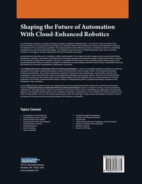 In a world where automation is quickly becoming a standard, a significant challenge arises - the need for robots to overcome their inherent limitations in processing power and storage. This bottleneck restricts their potential for innovation and collaboration, hindering the realization of true autonomous capabilities. The burgeoning field of Cloud Robotics promises a revolutionary solution by seamlessly integrating robots with cloud-based technologies. This integration empowers robots to offload computation tasks, tap into vast data resources, and engage in real-time collaboration with their mechanical counterparts. Existing literature often falls short of providing a holistic understanding of the complex interplay between robotics and cloud computing. Researchers, academics, and industry professionals find themselves grappling with fragmented insights, hindering their ability to harness the full potential of cloud-enhanced robotics. The lack of a centralized resource leaves a void, impeding progress and innovation in this groundbreaking field. Without a roadmap to navigate the challenges and opportunities presented by cloud robotics, stakeholders risk being left behind in an era where interdisciplinary collaboration is paramount. Enter Shaping the Future of Automation With Cloud-Enhanced Robotics , a beacon of knowledge designed specifically for academics, researchers, and industry professionals seeking to unlock the transformative power of cloud robotics. From fundamental principles to advanced applications, each chapter meticulously unravels the intricacies of cloud infrastructure, communication protocols, data management, human-robot interaction, and more. By addressing challenges and proposing solutions, this book not only disseminates recent advancements but also equips readers with actionable insights. Real-world examples and case studies illuminate the practical applications and benefits of cloud-enhanced robotics, making it an indispensable guide for professionals aiming to implement these innovations in their operations.