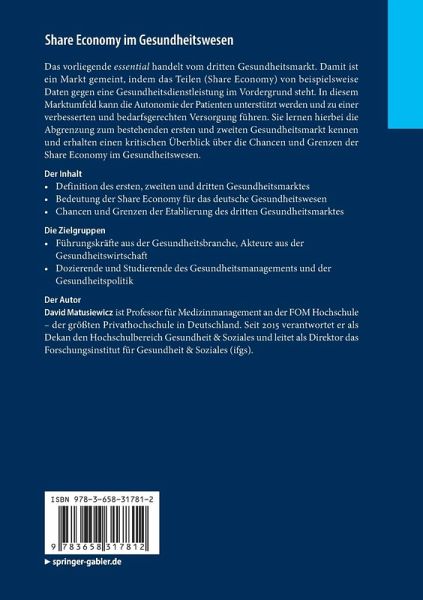 Das vorliegende essential handelt vom dritten Gesundheitsmarkt. Damit ist ein Markt gemeint, indem das Teilen (Share Economy) von beispielsweise Daten gegen eine Gesundheitsdienstleistung im Vordergrund steht. In diesem Marktumfeld kann die Autonomie der Patienten unterstützt werden und zu einer verbesserten und bedarfsgerechten Versorgung führen. Sie lernen hierbei die Abgrenzung zum bestehenden ersten und zweiten Gesundheitsmarkt kennen und erhalten einen kritischen Überblick über die Chancen und Grenzen der Share Economy im Gesundheitswesen.
