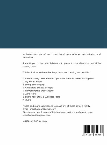 In loving memory of our many loved ones who we are grieving and mourning. Share Hope through Art's Mission is to prevent more deaths of despair by sharing hope. This book aims to share that help, hope, and healing are possible. This community book features 7 potential series of books as chapters: 1. Say Yes to Hope 2. Living Your Legacy 3. Ameliorate Stories of Hope 4. Remembering their Legacy 5. Zero Here 6. Share Your Story & Wellness Tools 7. 2050 Please add more submissions to make any of these series a reality! Email sharehopeart@gmail.com Directions on last 2 pages of this book and online sharehopeart.com sharehopeart.blogspot.com In USA call 988 for Help!