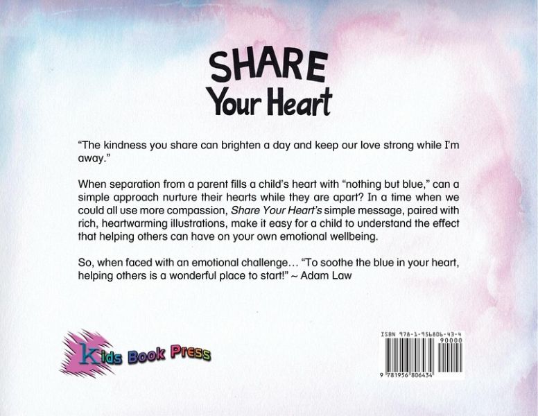"The kindness you share can brighten a day and keep our love strong while I'm away." When separation from a parent fills a child's heart with "nothing but blue," can a simple approach nurture their hearts while they are apart? In a time when we could all use more compassion, Share Your Heart's simple message, paired with rich, heartwarming illustrations, make it easy for a child to understand the effect that helping others can have on your own emotional wellbeing. So, when faced with an emotional challenge... "To soothe the blue in your heart, helping others is a wonderful place to start!" Adam Law