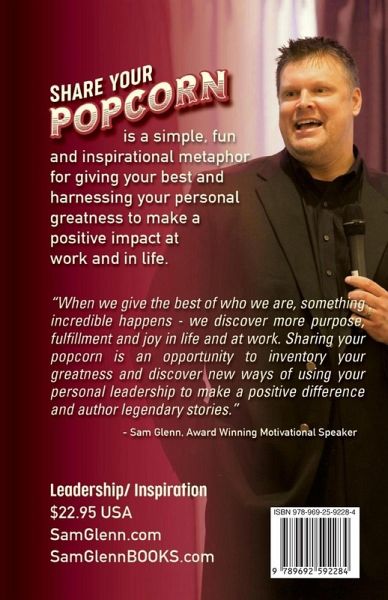 Share Your Popcorn 21 Inspiring Ways to Make a Difference Through Personal Leadership If there is one leadership book to read this year - it's Share Your Popcorn by Award Winning Motivational Speaker and Best Selling Author, Sam Glenn. Share Your Popcorn offers an enlightening metaphor for sharing your best and bringing out the best in others. This is the one book, organization's buy in bulk - it's that good. Discover 21 Inspiring Ways to Share Your Popcorn and Make an Incredible Difference Through Personal Leadership.