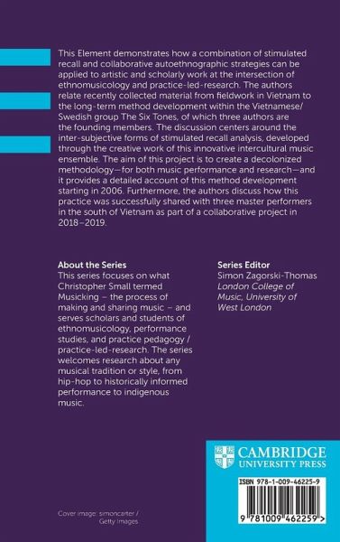This Element demonstrates how a combination of stimulated recall and collaborative autoethnographic strategies can be applied to artistic and scholarly work at the intersection of ethnomusicology and practice-led-research. The authors relate recently collected material from fieldwork in Vietnam to the long-term method development within the Vietnamese/Swedish group The Six Tones, of which three authors are the founding members. The discussion centers around the inter-subjective forms of stimulated recall analysis, developed through the creative work of this innovative intercultural music ensemble. The aim of this Element is to create a decolonized methodology-for both music performance and research-and it provides a detailed account of this method development starting in 2006. Furthermore, the authors discuss how this practice was successfully shared with three master performers in the south of Vietnam as part of a collaborative project in 2018-2019.
