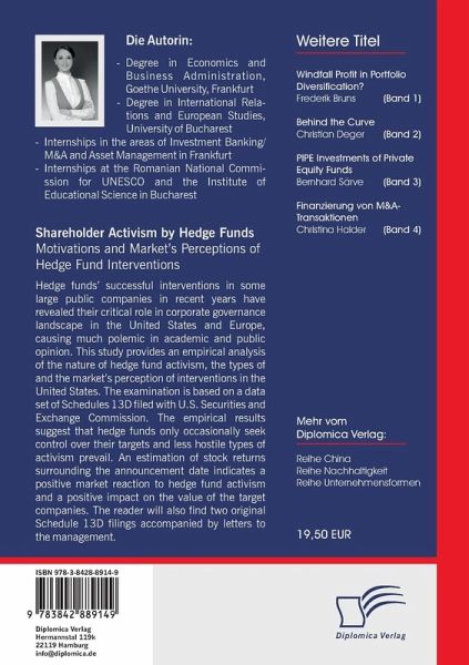 In recent years, hedge funds' successful interventions in some large public companies have revealed their critical role in the corporate governance landscape in the United States and Europe. Due to public opinion, this new form of shareholder activism is accompanied by much polemic. This study examines the nature of hedge fund activism, the types of them, and the market s perception of interventions in the United States. Starting with a distinction between shareholder activism by traditional institutions, and activism performed by hedge funds, the study elucidates why the latter may be more effective in monitoring management, and reduce agency costs. Analysing the Schedules 13D filed with the U.S. Securities and Exchange Commission, the study provides a classification of activists demands into ten distinct categories, arguing that hostile forms of activism are not central for hedge funds, and some more aggressive types of activism are possibly used as a negotiating tool to achieve the activist s agenda. Using the event study methodology, the author estimates the stock returns around the announcement date. For a better understanding of hedge fund activism, and their demands on target companies, the reader will find two original Schedule 13D filings accompanied by letters to the management. Finally, the paper concludes on a view of the subject through the prism of the 2007/ 2008 financial crisis, outlining some trends in the aftermath of the financial market turmoil.