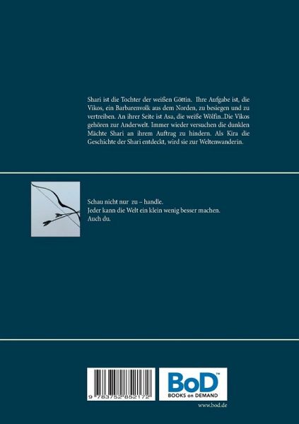Shari ist die Tochter der weißen Göttin. Sie wird von Luna, aus dem Hause Belgae geboren und aufgezogen. Ihre Aufgabe ist, die Vikos, ein Barbarenvolk aus dem Norden, zu besiegen und zu vertreiben. An ihrer Seite ist Asa, die weiße Wölfin.Die Vikos gehören zur Anderwelt. Immer wieder versuchen die dunklen Mächte Shari an ihrem Auftrag zu hindern. Als Kira die Geschichte der Shari entdeckt, wird sie zur Weltenwanderin.