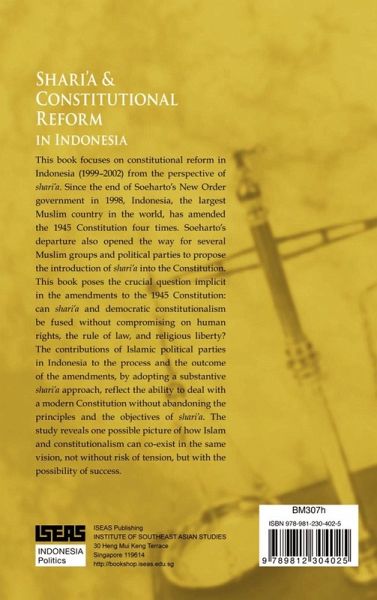 This book focuses on constitutional reform in Indonesia (1999-2002) from the perspective of shari'a. Since the end of Soeharto's New Order government in 1998, Indonesia, the largest Muslim country in the world, has amended the 1945 Constitution four times. Soeharto's departure also opened the way for several Muslim groups and political parties to propose the introduction of shari'a into the Constitution. This book poses the crucial question implicit in the amendments to the 1945 Constitution: can shari'a and democratic constitutionalism be fused without compromising on human rights, the rule of law, and religious liberty? The contributions of Islamic political parties in Indonesia to the process and the outcome of the amendments, by adopting a substantive shari'a approach, reflect the ability to deal with a modern Constitution without abandoning the principles and the objectives of shari'a. The study reveals one possible picture of how Islam and constitutionalism can co-exist in the same vision, not without risk of tension, but with the possibility of success.