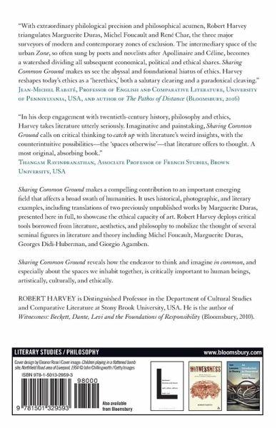 Sharing Common Ground makes a compelling contribution to an important emerging field that affects a broad swath of humanities. It uses historical, photographic, and literary examples, including an entirely new translation of a little known work by Marguerite Duras, presented here in full, to showcase the ethical capacity of art. Robert Harvey deploys critical tools borrowed from literature, aesthetics, and philosophy to mobilize the thought of several seminal figures in literature and theory including Michel Foucault, Marguerite Duras, Georges Didi-Huberman, and Giorgio Agamben, among a host of others. Construction sites, concentration camps, cemeteries, slums-such are only a few of the spaces that impel our imagination naturally toward what we commonly call "cultural memory." Sharing Common Ground reveals how the endeavor to think and imagine in common, and especially about the spaces we inhabit together, is critically important to human beings, artistically, culturally, and ethically.
