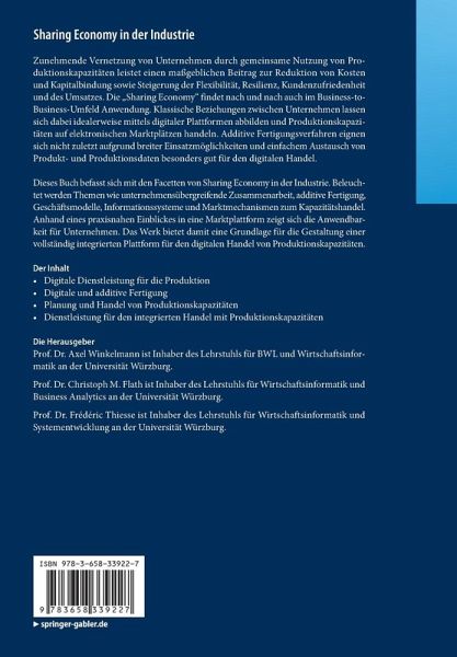 Dieses Buch befasst sich mit den Facetten von Sharing Economy in der Industrie. Beleuchtet werden Themen wie unternehmensübergreifende Zusammenarbeit, additive Fertigung, Geschäftsmodelle, Informationssysteme und Marktmechanismen zum Kapazitätshandel. Anhand eines praxisnahen Einblickes in die Marktplattform zeigt sich die Anwendbarkeit für Unternehmen. Das Werk bietet damit eine Grundlage für die Gestaltung einer vollständig integrierten Plattform für den digitalen Handel von Produktionskapazitäten.