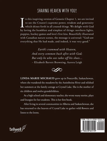 Sharing Heaven with You! In this inspiring version of Genesis Chapter 1, we are invited to see the Creator's supreme power, wisdom and generosity which shines forth in all created things. We delight with God by loving the humblest and simplest of things: northern lights, puppies, hockey games and love's first kiss. Beautifully illustrated with Canadian nature scenes, the message is universal: "God saw everything that He had made, and indeed, it was very good." Earth's crammed with Heaven, And every common bush afire with God; But only he who sees takes off his shoes... - Elizabeth Barrett Browning, Aurora Leigh