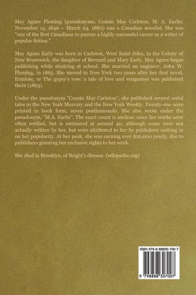 Dated but none the less masterfully written and vividly narrated. This book was a treasure from the first word to the very last. (Kevin William Barry) About the author: May Agnes Fleming (pseudonyms, Cousin May Carleton, M. A. Earlie; November 15, 1840 - March 24, 1880) was a Canadian novelist. She was "one of the first Canadians to pursue a highly successful career as a writer of popular fiction." May Agnes Early was born in Carleton, West Saint John, in the Colony of New Brunswick, the daughter of Bernard and Mary Early. May Agnes began publishing while studying at school. She married an engineer, John W. Fleming, in 1865. She moved to New York two years after her first novel, Erminie; or The gypsy's vow: a tale of love and vengeance was published there (1863). Under the pseudonym "Cousin May Carleton", she published several serial tales in the New York Mercury and the New York Weekly. Twenty-one were printed in book form, seven posthumously. She also wrote under the pseudonym, "M.A. Earlie". The exact count is unclear, since her works were often retitled, but is estimated at around 40, although some were not actually written by her, but were attributed to her by publishers cashing in on her popularity. At her peak, she was earning over $10,000 yearly, due to publishers granting her exclusive rights to her work. She died in Brooklyn, of Bright's disease. (wikipedia.org)