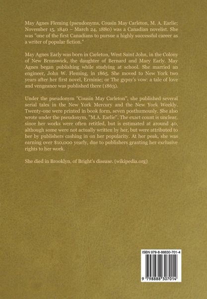 Dated but none the less masterfully written and vividly narrated. This book was a treasure from the first word to the very last. (Kevin William Barry) About the author: May Agnes Fleming (pseudonyms, Cousin May Carleton, M. A. Earlie; November 15, 1840 - March 24, 1880) was a Canadian novelist. She was "one of the first Canadians to pursue a highly successful career as a writer of popular fiction." May Agnes Early was born in Carleton, West Saint John, in the Colony of New Brunswick, the daughter of Bernard and Mary Early. May Agnes began publishing while studying at school. She married an engineer, John W. Fleming, in 1865. She moved to New York two years after her first novel, Erminie; or The gypsy's vow: a tale of love and vengeance was published there (1863). Under the pseudonym "Cousin May Carleton", she published several serial tales in the New York Mercury and the New York Weekly. Twenty-one were printed in book form, seven posthumously. She also wrote under the pseudonym, "M.A. Earlie". The exact count is unclear, since her works were often retitled, but is estimated at around 40, although some were not actually written by her, but were attributed to her by publishers cashing in on her popularity. At her peak, she was earning over $10,000 yearly, due to publishers granting her exclusive rights to her work. She died in Brooklyn, of Bright's disease. (wikipedia.org)
