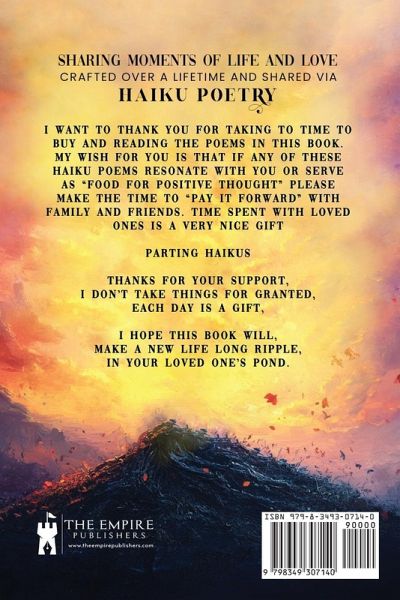I want to thank you for taking the time to buy and reading the poems in this book. My wish for you is that if any of these Haiku poems resonate with you or serve as "food for positive thought" please make the time to "pay it forward" with family and friends. Time spent with loved ones is a very nice gift. Parting Haikus - Thanks for your support, I don't take things for granted, Each day is a gift, I hope this book will, Make a new life long ripple, In your loved one's pond