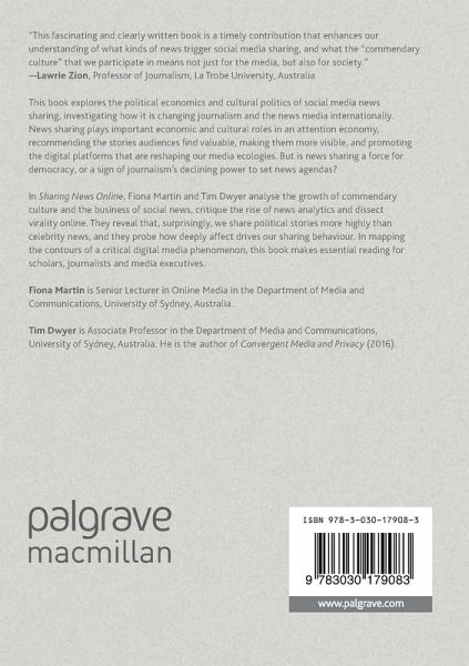 In Sharing News Online, Tim Dwyer and Fiona Martin analyse the growth of commendary culture and the business of social news, critique the rise of news analytics and dissect virality online. They reveal that surprisingly, we share political stories more highly than celebrity news, and they probe how deeply affect drives our sharing behaviour. In mapping the contours of a critical digital media phenomenon, this book makes essential reading for scholars, journalistsand media executives.