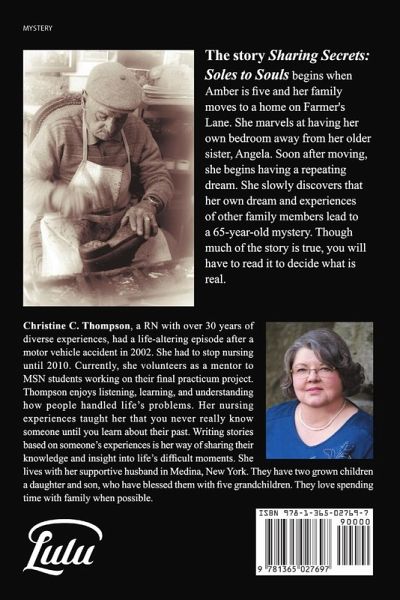 The story Sharing Secrets: Soles to Souls begins when Amber is five and her family moves to a home on Farmer's Lane. She marvels at having her own bedroom away from her older sister, Angela. Soon after moving, she begins having a repeating dream. She slowly discovers that her own dream and experiences of other family members lead to a 65-year-old mystery. Though much of the story is true, you will have to read it to decide what is real. Christine C. Thompson, a RN with over 30 years of diverse experiences, had a life-altering episode after a motor vehicle accident in 2002. She had to stop nursing until 2010. Currently, she volunteers as a mentor to MSN students working on their final practicum project. Thompson enjoys listening, learning, and understanding how people handled life's problems. Writing stories based on someone's experiences is her way of sharing their knowledge and insight into life's difficult moments.