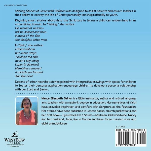 Sharing Stories of Jesus with Children was designed to assist parents and church leaders in their ability to convey the life of Christ personally and inspirationally to youth. Rhyming short stories abbreviate the Scripture in terms a child can understand in an entertaining format. In "Fishing," she writes: His words of wisdom will be shared and then instead of the fish the disciples catch men. In "Skin," she writes: Others will run but Jesus stays. Touches the skin doesn't shy away. Leper is cleansed, blemishes removed a miracle performed skin like new! Dozens of other heartfelt stories paired with interpretive drawings with space for children to foster their personal application encourage children to develop a personal relationship with our Lord and Savior.