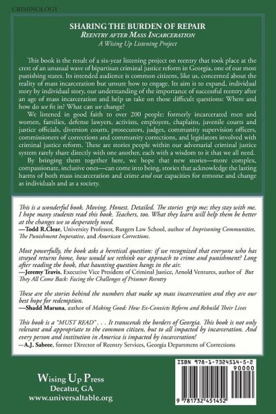 Sharing the Burden of Repair: Reentry After Mass Incarceration describes a six-year listening project on reentry that took place at the crest of an unusual wave of bipartisan criminal justice reform in Georgia, one of our most punishing states. Its primary intended audience is common citizens, like us, concerned about the reality of mass incarceration but unsure how to engage. Its aim is to expand, individual story by individual story, our understanding of the importance of successful reentry after an age of mass incarceration and help us take on those difficult questions: Where and how do wefit in? What can wechange? We listened to over 200 people: formerly incarcerated men and women, families, defense lawyers, activists, employers, chaplains, juvenile courts and justice officials, diversion courts, prosecutors, judges, community supervision officers, commissioners of corrections and community corrections, and legislators involved with criminal justice reform. We heard stories people within our adversarial criminal justice system rarely share directly with one another, each with a wisdom to it that we all need. By bringing them together here, we hope that new stories—more complex, compassionate, inclusive ones—can come into being, stories that acknowledge the lasting harms of both mass incarceration and crime andour capacities for remorse and change as individuals and as a society.
