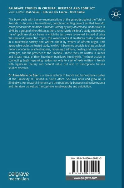 This book deals with literary representations of the genocide of the Tutsis in Rwanda. The focus is a transnational, polyphonic writing project entitled 'Rwanda: écrire par devoir de mémoire' (Rwanda: Writing by Duty of Memory), undertaken in 1998 by a group of nine African authors. This work emphasizes the Afropolitan cultural frame in which the texts were conceived and written. Instead of using Western and Eurocentric tropes, this volume looks at a so-called 'minority trauma': an African conflict situated in a collectivist society and written about by writers from African origin. This approach enables a more situated study, in which it becomes possible to draw out the local notions of ubuntu, oral testimonies, mourning traditions, healing and storytelling strategies, and the presence of the 'invisible'. As these texts are written in French and to date not all of them have been translated into English, most academic research has been done in French. This book thus assists inconnecting English-speaking readers not only to a set of texts written in French with significant literary and cultural value, but also to francophone trauma studies research.