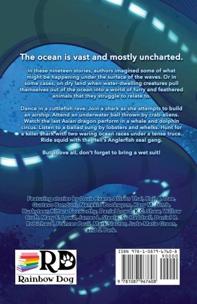 The ocean is vast and mostly uncharted. In these nineteen stories, authors imagined some of what might be happening under the surface of the waves. Or in some cases, on dry land when water-dwelling creatures pull themselves out of the ocean into a world of furry and feathered animals that they struggle to relate to. Dance in a cuttlefish rave. Join a shark as she attempts to build an airship. Attend an underwater ball thrown by crab-aliens. Watch the last Asian dragon perform in a whale and dolphin circus. Listen to a ballad sung by lobsters and whelks. Hunt for a killer shark with two waring ocean races under a tense truce. Ride squid with the Hell's Anglerfish seal gang. But above all, don't forget to bring a wet suit! Featuring stories by Louis Evans, Allison Thai, Koji A. Dae, Gustavo Bondoni, Nenekiri Bookwyrm, Kary M. Jomb, Huskyteer, Kittara Foxworthy, Daniel Lowd, K.C. Shaw, Willow Croft, Mary E. Lowd, James L. Steele, Su Haddrell, Daniel R. Robichaud, Frances Pauli, Mark Slauter, Jude-Marie Green, and S. Park.