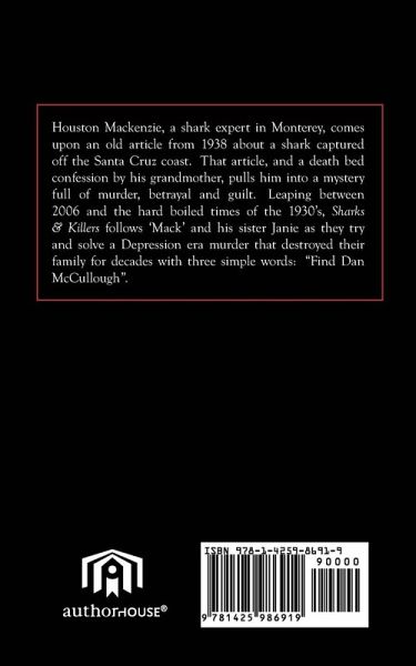 Houston Mackenzie, a shark expert in Monterey, comes upon an old article from 1938 about a shark captured off the Santa Cruz coast. That article, and a death bed confession by his grandmother, pulls him into a mystery full of murder, betrayal and guilt. Leaping between 2006 and the hard boiled times of the 1930's, Sharks and Killers follows 'Mack' and his sister Janie as they try and solve a Depression era murder that destroyed their family for decades with three simple words: "Find Dan McCullough".