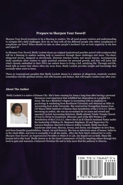 Shelly Lockett is a native of Kansas City. She's been running for Jesus a long time after having a personal Damascus road experience that solidified her disposition as a pugilist for Jesus. She has a Bachelor's degree in accounting with an emphasis in psychology & marketing from Rockhurst University and obtained an MBA in Accounting from Avila University. She received her Evangelism license from CH Mason Bible Institute of Kansas East Jurisdiction of the C.O.G.I.C. Before becoming an author, she was an accountant for 20 years and owned and operated Lockett Accounting Solutions. Shelly attends Trinity Temple Church of God In Christ in Grandview, Missouri, part of the MO Western 2nd Jurisdiction of the C.O.G.I.C, where she is an E-Church Assistant Pastor under the leadership of Bishop Dr. Benjamin Stephens, III and Supervisor Dr. Latonya Stephens. Married to Deacon Jeffrey Lockett, Shelly has three handsome adult sons, Marcus, Juwan, and Javon, one daughter-in-love Brae, and three beautiful grandchildren, Daniel, Jai and Kamryn. She has an infectious sense of humor, believes in the whole Bible, and tries to exemplify it to all she meets. After the Holy Spirit ordered her to write Sharpen Your Sword: 50 Inspirational Parables to Make It in Life, she leaped out on faith. Many life lessons led to this book. Shelly desires to do the Great Commission of God by inspiring others through this book to gain and maintain a balanced Christian life and to help more find the pathway to Heaven.