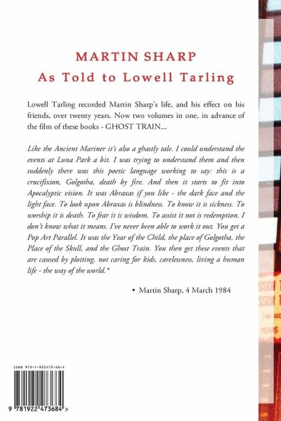 Lowell Tarling recorded Martin Sharp's life, and his effect on his friends, over twenty years. Now two volumes in one, in advance of the film of these books - GHOST TRAIN... Sharp: The Road to Abraxas - Part One, 1942-1979 Sharper: Bringing It All Back Home - Part Two, 1980-2013 'Like the Ancient Mariner, it's also a ghastly tale. I could understand the events at Luna Park a bit. I was trying to understand them and then suddenly there was this poetic language working to say: this is a crucificion, Golgotha, death by fire. And then it starts to fit into Apocalyptic vision. It was Abraxas if you like - the dark face and the light face. To look upon Abraxas is blindness. To know it is sickness. To worship it is death. To fear it is wisdom. To assist it not is redemption. I don't know what it means. I've never been able to work it out. You get a Pop Art Parallel. It was the Year of the Child, the place of Golgotha, the Place of the Skull, and the Ghost Train. You then get these events that are caused by plotting, not caring for kids, carelessness, living a human life - the way of the world.' - Martin Sharp, 4 March 1984
