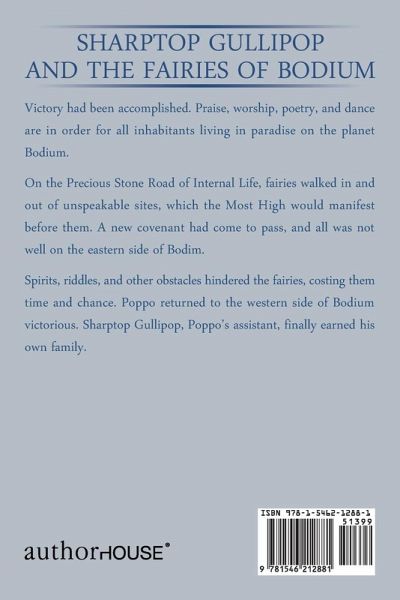 Victory had been accomplished. Praise, worship, poetry, and dance are in order for all inhabitants living in paradise on the planet Bodium. On the Precious Stone Road of Internal Life, fairies walked in and out of unspeakable sites, which the Most High would manifest before them. A new covenant had come to pass, and all was not well on the eastern side of Bodim. Spirits, riddles, and other obstacles hindered the fairies, costing them time and chance. Poppo returned to the western side of Bodium victorious. Sharptop Gullipop, Poppo?s assistant, finally earned his own family.