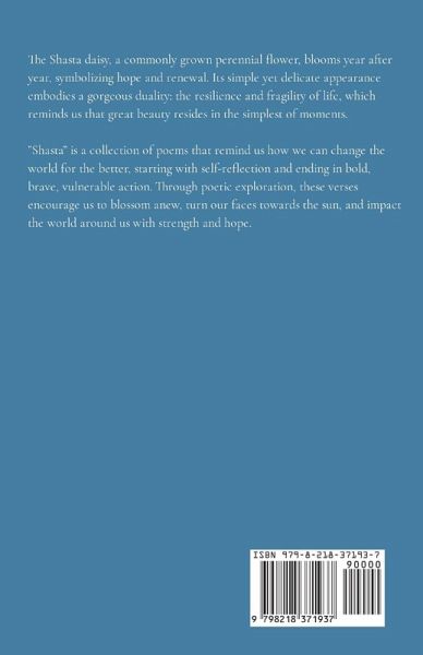 The Shasta daisy, a commonly grown perennial flower, blooms year after year, symbolizing hope and renewal. Its simple yet delicate appearance embodies a gorgeous duality: the resilience and fragility of life, which reminds us that great beauty often resides in the simplest of moments. "Shasta" is a collection of poems that remind us of how we can change the world for the better, starting with self-reflection and ending in bold, brave, vulnerable action. Through poetic exploration, these verses encourage us to blossom anew, turn our faces towards the sun, and impact the world around us with strength and hope.