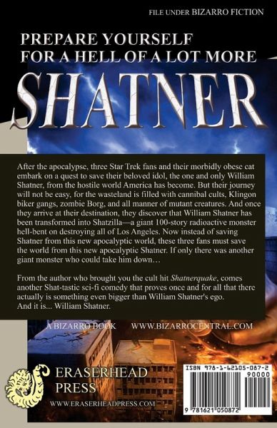 After the apocalypse, three Star Trek fans and their morbidly obese cat embark on a quest to save their beloved idol, the one and only William Shatner, from the hostile world America has become. But their journey will not be easy, for the wasteland is filled with cannibal cults, Klingon biker gangs, Zombie Borg, and all manner of mutant creatures. And once they arrive at their destination, they discover that William Shatner has been transformed into Shatzilla - a giant 100-story radioactive monster hell-bent on destroying all of Los Angeles. Now instead of saving Shatner from this new apocalyptic world, these three fans must save the world from this new apocalyptic Shatner. If only there was another giant monster who could take him down... From the author who brought you the cult hit Shatnerquake, comes another Shat-tastic sci-fi comedy that proves once and for all that there actually is something even bigger than William Shatner's ego. And it is... William Shatner.