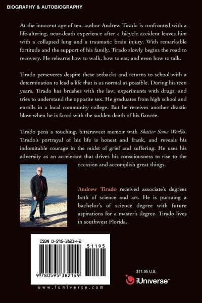 At the innocent age of ten, author Andrew Tirado is confronted with a life-altering, near-death experience after a bicycle accident leaves him with a collapsed lung and a traumatic brain injury. With remarkable fortitude and the support of his family, Tirado slowly begins the road to recovery. He relearns how to walk, how to eat, and even how to talk. Tirado perseveres despite these setbacks and returns to school with a determination to lead a life that is as normal as possible. During his teen years, Tirado has brushes with the law, experiments with drugs, and tries to understand the opposite sex. He graduates from high school and enrolls in a local community college. But he receives another drastic blow when he is faced with the sudden death of his fiancée. Tirado pens a touching, bittersweet memoir with Shatter Some Worlds. Tirado's portrayal of his life is honest and frank, and reveals his indomitable courage in the midst of grief and suffering. He uses his adversity as an accelerant that drives his consciousness to rise to the occasion and accomplish great things.