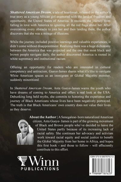 Shattered American Dream, a tale of heartbreak, is based on the author's true story as a young African girl enamored with the land of freedom and opportunity, the United States of America. It recounts the journey from falling in love with America to ignoring all the red flags about her. After overcoming every obstacle to join her and then landing there, the author discovers that she was a mirage of illusions. While the journey included positive learnings and valuable experiences, it didn't come without disappointment. Realizing there was a huge dichotomy between the America that was projected and the one that most black and brown people navigate daily, the author discovered America is rooted in white supremacy and institutional racism. Offering an opportunity for readers who are interested in cultural competency and antiracism, Gueye-James shares what it's like to navigate White American spaces as an immigrant or Global Majority member, suddenly minoritized. In Shattered American Dream, Anta Gueye-James warns the youth who have dreams of coming to America and offers a real look at the USA. Debunking long held myths, she commits to honoring the experience and journey of Black Americans whose lives have been negatively portrayed. The truth is that Black Americans' own country does not value their lives as they deserve.