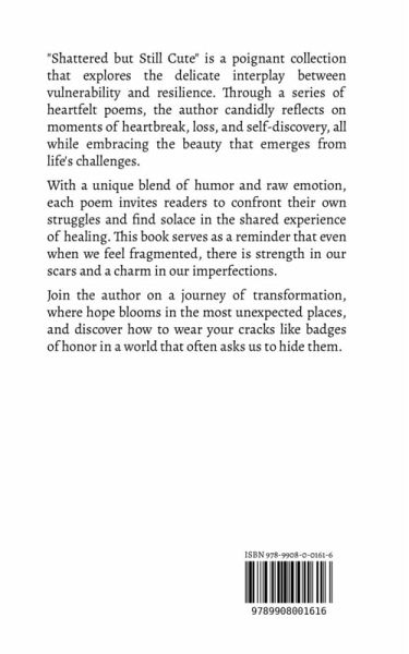 "Shattered but Still Cute" is a poignant collection that explores the delicate interplay between vulnerability and resilience. Through a series of heartfelt poems, the author candidly reflects on moments of heartbreak, loss, and self-discovery, all while embracing the beauty that emerges from life's challenges. With a unique blend of humor and raw emotion, each poem invites readers to confront their own struggles and find solace in the shared experience of healing. This book serves as a reminder that even when we feel fragmented, there is strength in our scars and a charm in our imperfections. Join the author on a journey of transformation, where hope blooms in the most unexpected places, and discover how to wear your cracks like badges of honor in a world that often asks us to hide them.