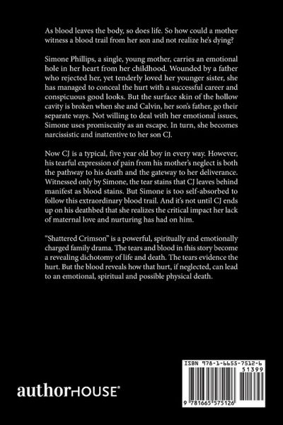 As blood leaves the body, so does life. So how could a mother witness a blood trail from her son and not realize he's dying? Simone Phillips, a single, young mother, carries an emotional hole in her heart from her childhood. Wounded by a father who rejected her, yet tenderly loved her younger sister, she has managed to conceal the hurt with a successful career and conspicuous good looks. But the surface skin of the hollow cavity is broken when she and Calvin, her son's father, go their separate ways. Not willing to deal with her emotional issues, Simone uses promiscuity as an escape. In turn, she becomes narcissistic and inattentive to her son CJ. Now CJ is a typical, five year old boy in every way. However, his tearful expression of pain from his mother's neglect is both the pathway to his death and the gateway to her deliverance. Witnessed only by Simone, the tear stains that CJ leaves behind manifest as blood stains. But Simone is too self-absorbed to follow this extraordinary blood trail. And it's not until CJ ends up on his deathbed that she realizes the critical impact her lack of maternal love and nurturing has had on him. "Shattered Crimson" is a powerful, spiritually and emotionally charged family drama. The tears and blood in this story become a revealing dichotomy of life and death. The tears evidence the hurt. But the blood reveals how that hurt, if neglected, can lead to an emotional, spiritual and possible physical death.
