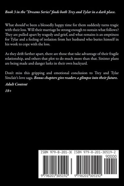 Book 3 in the "Dreams Series" finds both Trey and Tylar in a dark place. What should've been a blessedly happy time for them suddenly turns tragic with their loss. Will their marriage be strong enough to sustain what follows? They are pulled apart by tragedy and grief, and what remains is an emptiness for Tylar and a feeling of isolation from her husband who buries himself in his work to cope with the loss. As they drift farther apart, there are those that take advantage of their fragile relationship, and others that plot to do much more than that. Sinister plans are being made and danger lurks in their own backyard. Don't miss this gripping and emotional conclusion to Trey and Tylar Sinclair's love saga. Bonus chapters give readers a glimpse into their future. Adult Content 18+