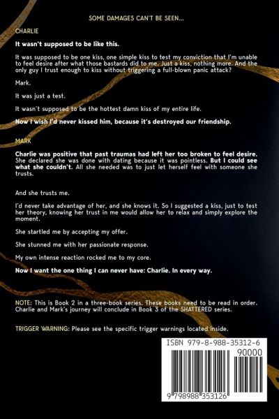 Some damages can't be seen... CHARLIE It wasn't supposed to be like this. It was supposed to be one kiss, one simple kiss to test my conviction that I'm unable to feel desire after what those bastards did to me. Just a kiss, nothing more. And the only guy I trust enough to kiss without triggering a full-blown panic attack? Mark. It was just a test. It wasn't supposed to be the hottest damn kiss of my entire life. Now I wish I'd never kissed him, because it's destroyed our friendship. MARK Charlie was positive that past traumas had left her too broken to feel desire. She declared she was done with dating because it was pointless. But I could see what she couldn't. All she needed was to just let herself feel with someone she trusts. She trusts me. Charlie knows I'd never take advantage of her. I suggested we kiss, just to test her theory, knowing her trust in me would allow her to relax and simply explore the moment. She startled me by accepting my offer. She stunned me with her passionate response. My own intense reaction rocked me to my core. Now I want the one thing I can never have: Charlie. In every way. NOTE: This is Book 2 in a three-book series. These books need to be read in order. Charlie and Mark's journeys to self-acceptance will conclude in Book 3 of the SHATTERED series. NOTE: The series ends with a HEA, but the first and second novels do not. TRIGGER WARNING: This book contains subject matter which some readers may be sensitive to. Please read the note from the author to see if this book is a fit for you. Specific trigger warnings are located inside.
