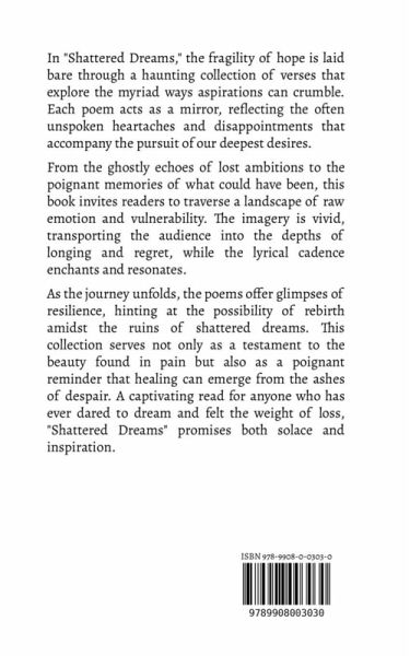 In "Shattered Dreams," the fragility of hope is laid bare through a haunting collection of verses that explore the myriad ways aspirations can crumble. Each poem acts as a mirror, reflecting the often unspoken heartaches and disappointments that accompany the pursuit of our deepest desires. From the ghostly echoes of lost ambitions to the poignant memories of what could have been, this book invites readers to traverse a landscape of raw emotion and vulnerability. The imagery is vivid, transporting the audience into the depths of longing and regret, while the lyrical cadence enchants and resonates. As the journey unfolds, the poems offer glimpses of resilience, hinting at the possibility of rebirth amidst the ruins of shattered dreams. This collection serves not only as a testament to the beauty found in pain but also as a poignant reminder that healing can emerge from the ashes of despair. A captivating read for anyone who has ever dared to dream and felt the weight of loss, "Shattered Dreams" promises both solace and inspiration.