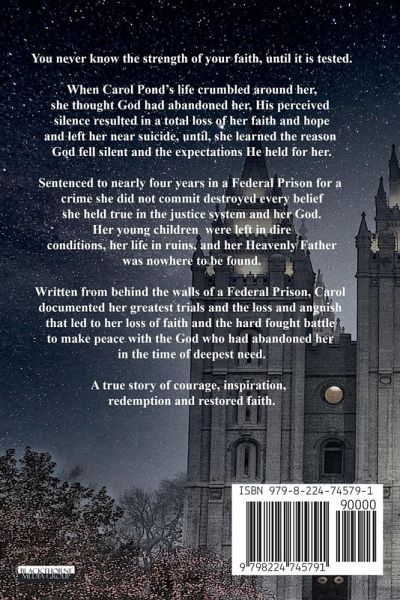 You never know the strength of your faith, until it is tested. When Carol Pond's life crumbled around her, she thought God had abandoned her, His perceived silence resulted in a total loss of her faith and hope and left her near suicide, until, she learned the reason God fell silent and the expectations He held for her. Sentenced to nearly four years in a Federal Prison for a crime she did not commit destroyed every belief she held true. Her young children were left in dire conditions, her life in ruins, and her Heavenly Father nowhere to be found. Written from behind the walls of a Federal Prison, Carol documented her greatest trials and the loss and anguish that led to her loss of faith and the hard fought battle to make peace with the God who had left her alone in her time of deepest need. A true story of courage, inspiration, redemption and restored faith.