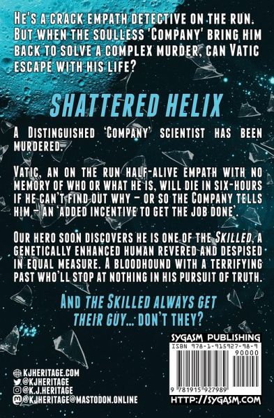 A war-damaged empath with six hours to live is forced to solve a series of mind-bending murders. A top Company scientist has been murdered. Vatic, an on-the-run half-alive empath with no memory of who or what he is, will die in six-hours if he can't find out why-or so the Company tells him-an 'added incentive to get the job done'. Our hero soon discovers he is one of the Skilled, a genetically enhanced human-revered and despised in equal measure-a bloodhound with a terrifying past who'll stop at nothing in his pursuit of truth. And 'the Skilled always get their guy'... don't they? WHAT OTHER BESTSELLING AUTHORS ARE SAYING ABOUT SHATTERED HELIX: "Gritty,intense, and compelling, Shattered Helix is something you don't run into often enough in Sci-Fi--a cerebral thrill ride you don't want to end." -Michael Bunker, US TODAY Bestsellingauthor of Pennsylvania "K.J.Heritage's uncanny sense of pacing and story puts him at the forefront of today's speculative fiction writers." -Samuel Peralta, Amazon bestselling author and creator of The Future Chronicles "Prepare to lose sleep reading Shattered Helix! Delicious Sci-Fiction!" -Kate Danley, US TODAY bestselling author "Gritty,detailed and unrelenting--Shattered Helix will take you on a wild ride." -Peter Cawdron, International Bestselling author of Science Fiction
