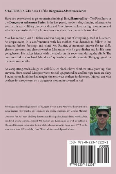 SHATTERED ICE: Book 1 of the Dangerous Adventures Series Have you ever wanted to be on an outdoor adventure? Would you want a little magical realism added to complicate things? Max thought he wanted both—until the worst accident in Mt Rainier's history happened. Seriously, have you ever wanted to go mountain climbing? If so, Shattered Ice---The First Story in the Dangerous Adventure Series, is the fast-paced, modern-day, climbing adventure for you. In this story Hillary discovers Max and Max discovers a love for high mountains and what it means to be there for his team—even when the crevasse is bottomless! Max has recently lost his father and is dropping out of everything. Mad at his coach, he drops soccer. In a confrontation with his mother, Max demands to follow in his deceased father's footsteps and climb Mt. Rainier. A mountain known for ice cliffs, glaciers, crevasses, and chaotic weather. Max trains with his grandfather and his life starts going better. He makes friends with the adults on his rope team during the climb. The last thousand feet are hard, Max doesn't quit—he makes the summit. Things go good on the way down until-- An earsplitting crack, a huge ice wall falls, ice blocks shove climbers into a yawning, blue crevasse. Hurt, scared, Max just wants to curl up, pretend he and his rope team are okay. But, in soccer, his father had taught him to always be there for his team. Injured, can Max be there for a rope team on a dangerous mountain covered in ice? Book 1 in the Dangerous Adventure Series, Shattered Ice, is a realistic, modern day climb of Mt. Rainier in Washington State. Robby, the author, didn't just research the story. He climbed the 14,411 foot mountain and is personally acquainted with the fear and pain a tragic ice fall presents. Robby writes about the outdoors with total realism. Shattered Ice will suit anyone who enjoyed Gary Paulsen's Hatchet or Roland Smith's Peak Marcello stories.