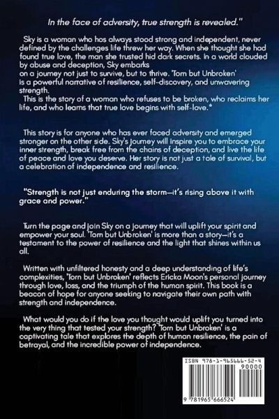 In the face of adversity, true strength is revealed. Sky is a woman who has always stood strong and independent, never defined by the challenges life threw her way. When she thought she had found true love, the man she trusted hid dark secrets. In a world clouded by abuse and deception, Sky embarks on a journey not just to survive, but to thrive. 'Torn but Unbroken' is a powerful narrative of resilience, self-discovery, and unwavering strength. This is the story of a woman who refuses to be broken, who reclaims her life, and who learns that true love begins with self-love. This story is for anyone who has ever faced adversity and emerged stronger on the other side. Sky's journey will inspire you to embrace your inner strength, break free from the chains of deception, and live the life of peace and love you deserve. Her story is not just a tale of survival, but a celebration of independence and resilience. "Strength is not just enduring the storm-it's rising above it with grace and power." Turn the page and join Sky on a journey that will uplift your spirit and empower your soul. 'Torn but Unbroken' is more than a story-it's a testament to the power of resilience and the light that shines within us all. Written with unfiltered honesty and a deep understanding of life's complexities, 'Torn but Unbroken' reflects Ericka Moon's personal journey through love, loss, and the triumph of the human spirit. This book is a beacon of hope for anyone seeking to navigate their own path with strength and independence. What would you do if the love you thought would uplift you turned into the very thing that tested your strength? 'Torn but Unbroken' is a captivating tale that explores the depth of human resilience, the pain of betrayal, and the incredible power of independence.