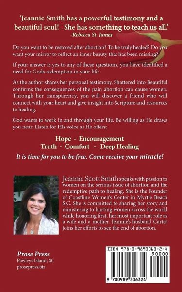 Shattered into Beautiful - Second Edition 2013 By Jeannie Scott Smith Do you want to be restored after abortion? To be truly healed? Do you want your mirror to reflect an inner beauty that has been missing? If your answer is yes to any of these questions, you have identified a need for Gods redemption in your life. The author shares her personal testimony, confirms the consequences of the pain abortion can cause women. Through her transparency, you will discover a friend who will connect with your heart and give insight into Scripture and resources to healing. God wants to work in and through your life. Be willing as He draws you near. Listen for His voice as He offers: Hope, Encouragement, Truth, Comfort, Deep Healing It is time for you to be free. Come receive your miracle!